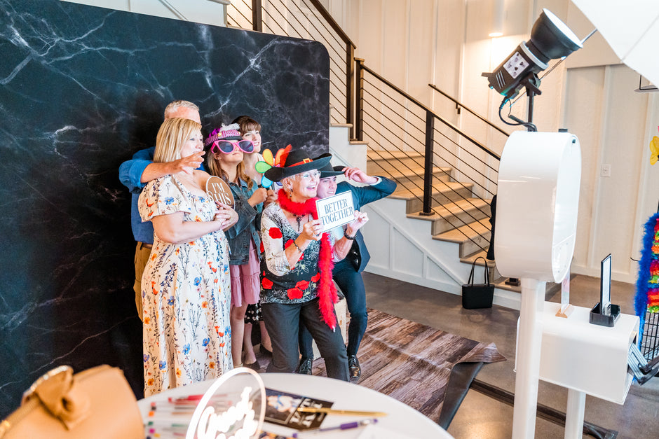 Our wedding photo booth package includes the rental of a sleek photo booth with stunning LED and professional lighting to make your photos pop, instant on the spot photo printing and a chic marble backdrop in black or white for that extra wow factor.